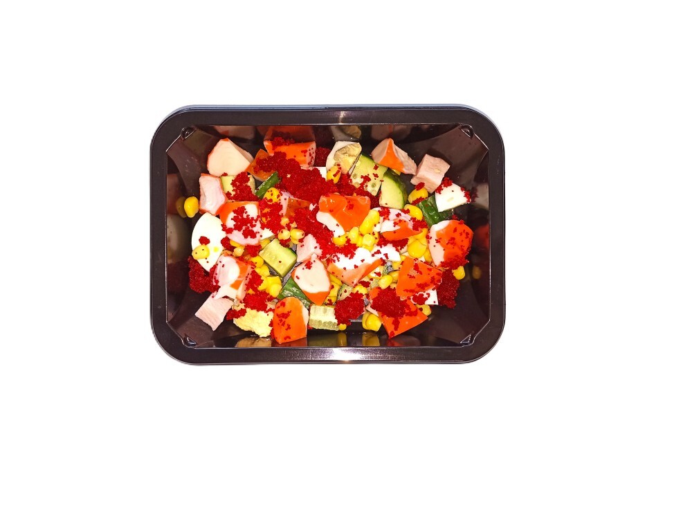 Крабовое мясо, огурец свежий, икра масаго, яйцо, кукуруза, карбонад, майонез.